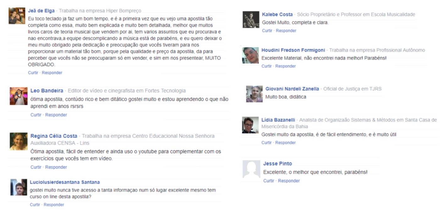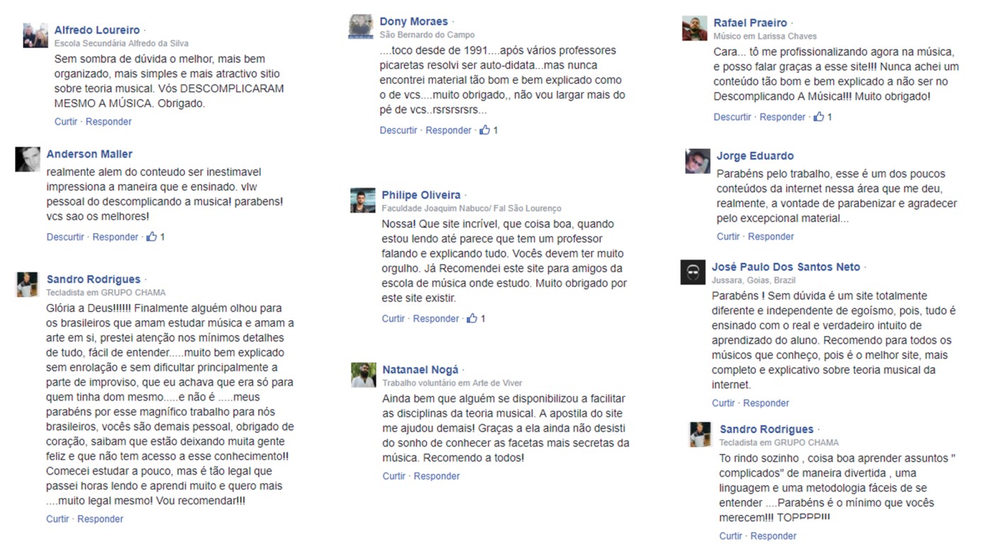 A gratidão de nossos alunos é o que mais nos motiva a continuar com o trabalho. Nossa política é trabalhar com preços acessíveis, para que todos possam aprender música, independentemente de classe social. Por isso, muitos ficam surpresos com a qualidade do material, pois não esperavam que por um preço tão baixo fosse possível ter acesso a um conteúdo tão original e completo. Confira abaixo alguns comentários: